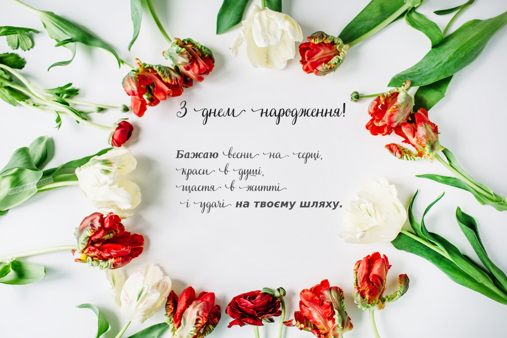 Вітаю з днем народження і від щирого серця хочу побажати будь-якої пори року знаходити для душі натхнення, в будь-якій ситуації дивитися на світ з позитивного боку. Бажаю почуватися абсолютно щасливою людиною, бажаю завжди мати чудову нагоду любити, мріяти, творити, дарувати коханим ніжність і турботу. І хай у твоєму житті буде багато яскравих фарб, багато свят, багато перемог!